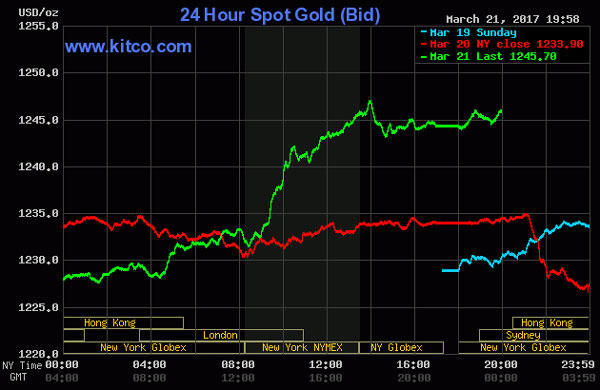 Tới đầu giờ sáng 22/3 (giờ Việt Nam), giá vàng thế giới giao ngay đứng ở mức 1.245,6 USD/ounce, tăng khoảng 14 USD so với cùng giờ phiên liền trước.