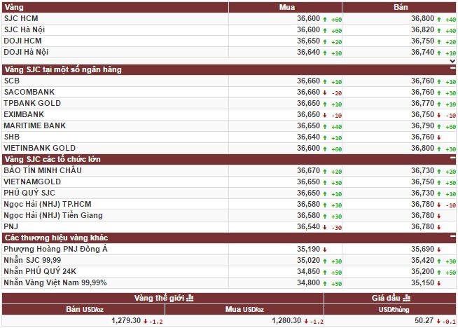 Công ty vàng bạc đá quý Sài Gòn niêm yết giá vàng SJC sáng 20/4 ở mức 36,61 triệu đồng/lượng (mua vào) và 36,85 triệu đồng/lượng (bán ra), tăng 70 ngàn đồng ở cả 2 chiều mua vào và chiều bán ra so với cuối giờ chiều 20/4.