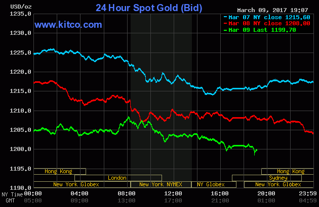 Sáng nay 7:00 theo giờ Việt Nam, giá vàng giao ngay trên sàn Kitco đứng tại 1.199,7USD/oz, giảm 1% so với chốt phiên trước.