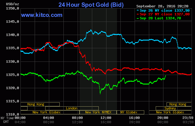 Sáng nay 7:00 theo giờ Việt Nam, giá vàng giao ngay trên sàn Kitco đứng tại 1.324,7USD/oz, giảm 0,2% so với chốt phiên trước.