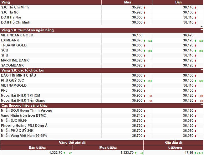 Tại thị trường TP HCM, giá vàng SJC giao dịch quanh mức 35,92 – 36,14 triệu đồng/lượng (chiều mua – bán). Giá vàng SJC giao dịch tại thị trường Hà Nội tại mức 36,92 - 36,16 triệu đồng/lượng (chiều mua – bán).