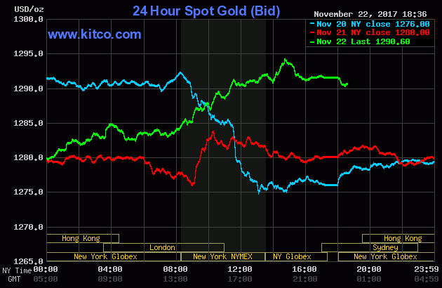 Giá vàng thế giới trên sàn Kitco giao dịch ở mức 1290.60 - 1291.60 USD/ounce. Đêm qua, giá vàng có lúc lên cao nhất 1295,30, thấp nhất 1279.60 USD/ounce.