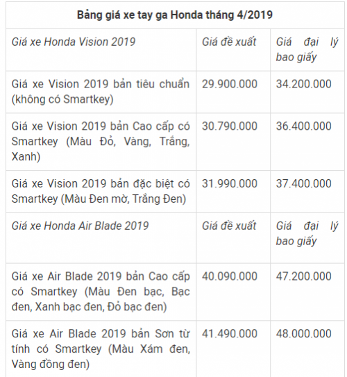 Trên báo điện tử Infonet thông tin về bảng giá bán xe Honda tại đại lý đã bao giấy trên đã gồm thuế VAT, lệ phí trước bạ và phí cấp biển số, bảo hiểm xe máy.