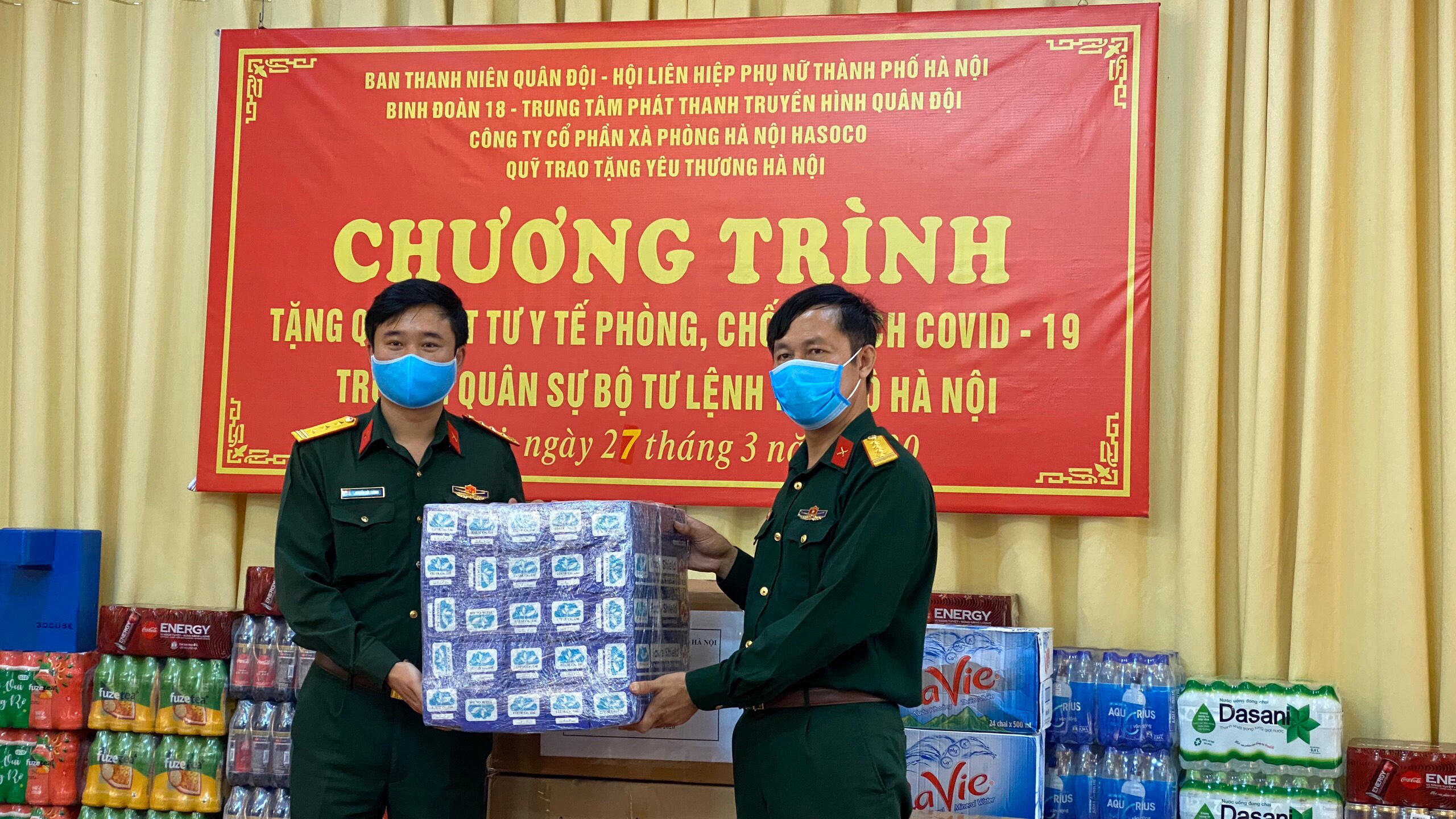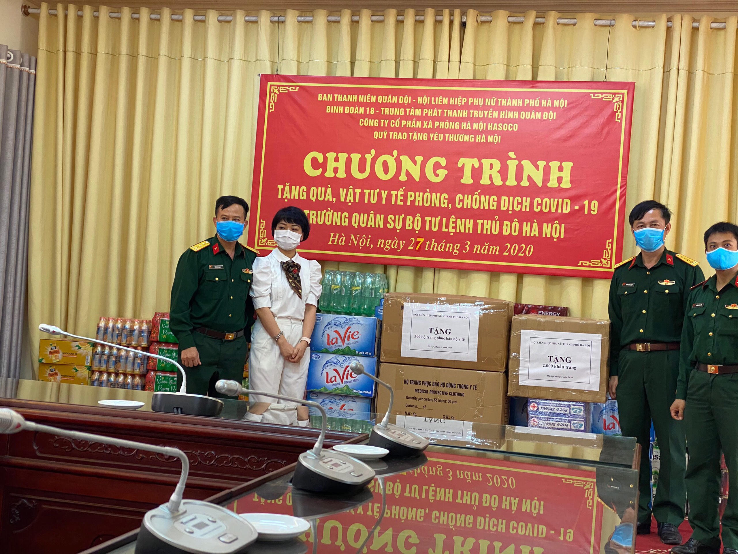 Hưởng ứng lời kêu gọi của Thủ tướng Chính phủ và UBMT Tổ quốc Việt Nam về việc chung tay ủng hộ công tác phòng, chống dịch Covid-19, chiều nay ngày 27/3, Trường Quân sự, Bộ Tư lệnh Thủ đô, đã tiếp nhận vât tư y tế, quần áo bảo hộ, nước sát khuẩn, khẩu trang, mặt nạ kháng khuẩn, máy rửa tay tự động... của các đơn vị, Ban Thanh niên Quân đội, Hội Liên hiệp Phụ nữ thành phố Hà Nội, Công ty cổ phần Xà phòng Hà Nội, Quỹ trao tặng yêu thương, Quỹ tấm lòng việt.