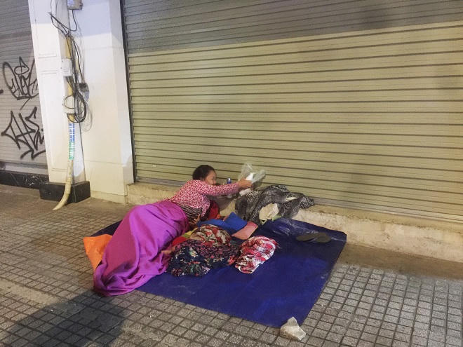 Họ ngồi bệt xuống lề đường, đợi giấc ngủ nhọc nhằn, đợi người qua lại dúi cho vài đồng lẻ. Họ lựa những mái hiên rộng có thể che mưa, che sương rồi trải tấm bạt nhỏ hoặc đôi tấm bìa giấy làm nơi ngả lưng qua đêm.