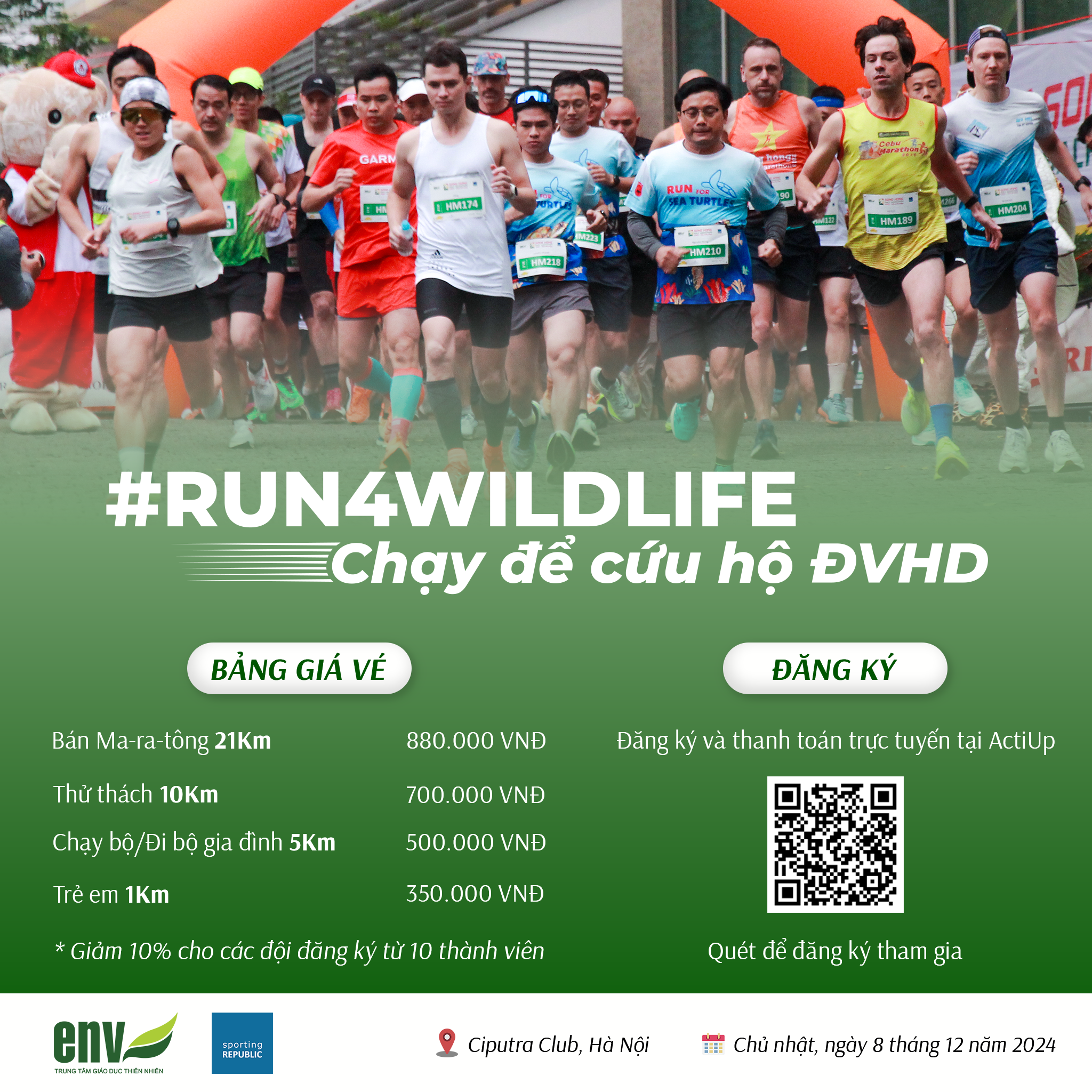 (PLVN) - Vào ngày 8/12/2024 tới đây, Trung tâm Giáo dục Thiên nhiên (ENV) tiếp tục đồng hành cùng Sporting Republic tổ chức giải chạy “Song Hong Half Marathon 2024” - #Run4WildlifeHN tại Khu đô thị Ciputra (Hà Nội). “Song Hong Half Marathon 2024” - #Run4WildlifeHN là giải chạy được tổ chức thường niên nhằm lan tỏa thông điệp bảo vệ các loài động vật hoang dã (ĐVHD) tại Việt Nam.