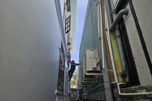 Lực lượng chức năng phải dùng thang trèo lên lầu giải cứu các nạn nhân |
