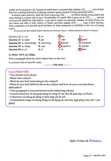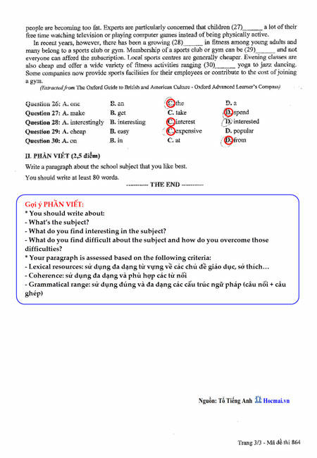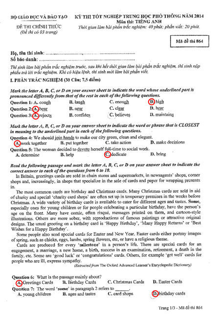 (PLO) -Với bài thi này sẽ rất dễ để các em đạt được mức điểm từ 8 trở lên, nhưng nếu muốn được trọn vẹn 10 điểm thì hơi khó. Pháp luật Việt Nam trân trọng gửi tới độc giả đáp án đề thi tốt nghiệp THPT môn Tiếng Anh 2014