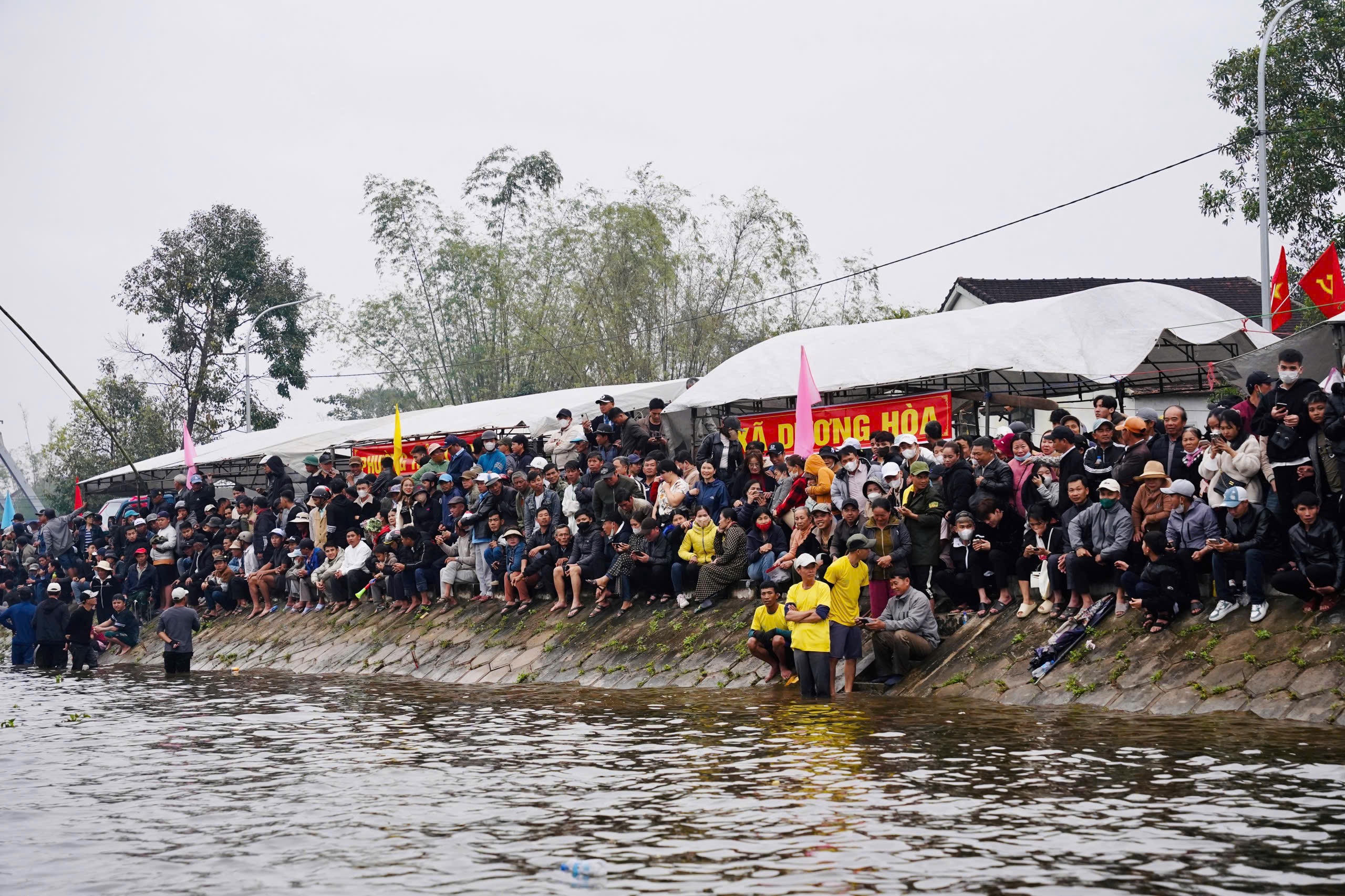 Từ sáng sớm, đông đảo người dân đã có mặt hai bên bờ sông Vực để ngóng chờ những phần thi gay cấn của các đội đua.