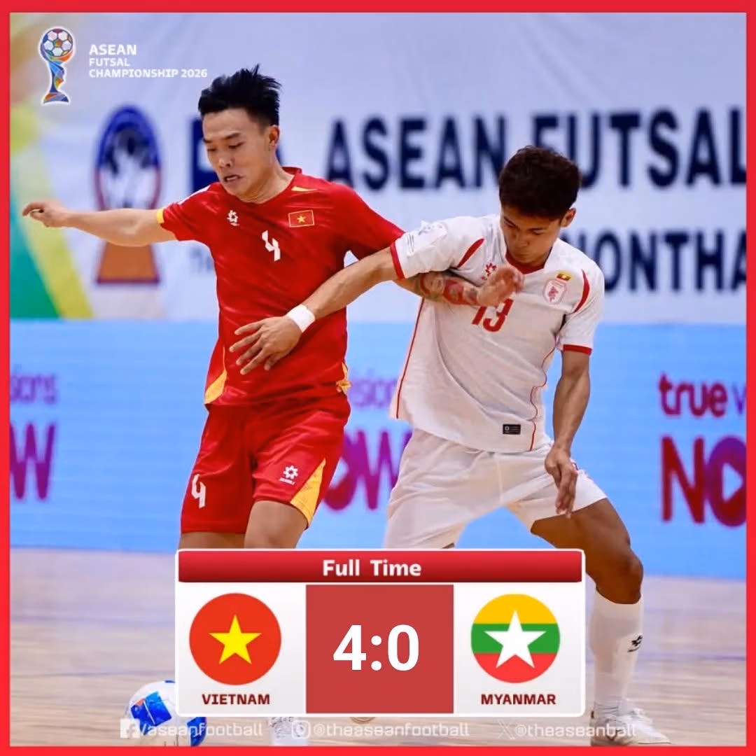 Chung cuộc, đội tuyển futsal Việt Nam giành chiến thắng 4-0 trước Myanmar, qua đó có khởi đầu thuận lợi tại giải đấu. Ở lượt trận tiếp theo, thầy trò HLV Diego Giustozzi sẽ gặp Timor-Leste (17h30 ngày 7/4), trước khi bước vào trận đấu được xem là quyết định ngôi đầu bảng với chủ nhà Thái Lan.