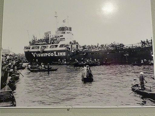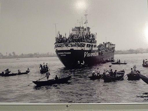 Ngày 28/3, ngoài bến tàu, dòng người sợ hãi đã đông nghịt. Những tấm gỗ xám, lâu đời kêu răng rắc dưới sức nặng của hàng nghìn người Việt Nam. Họ chen lấn, xô đẩy nhau. Đây là chuyến đi cuối cùng. Chung quanh mỗi cột cầu tàu, thuyền và tàu kéo đậu thành ba hàng, chở người tị nạn đứng ngồi như nhét khoai tây.