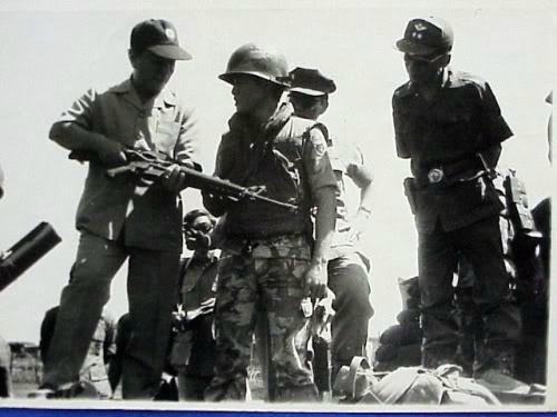 | Tại QK2, mặt trận Bắc Kontum, vùng biên giới Lào-Việt, tướng tư lệnh vùng Phạm Văn Phú, hướng dẫn Nguyễn Văn Thiệu thăm một đơn vị Biệt động quân |