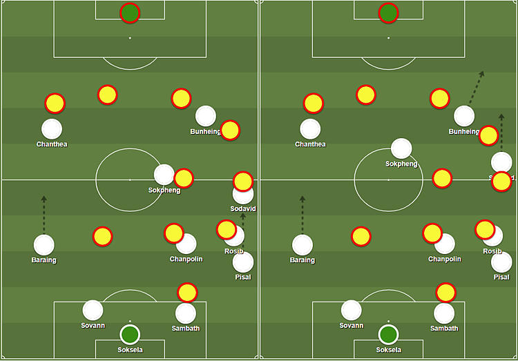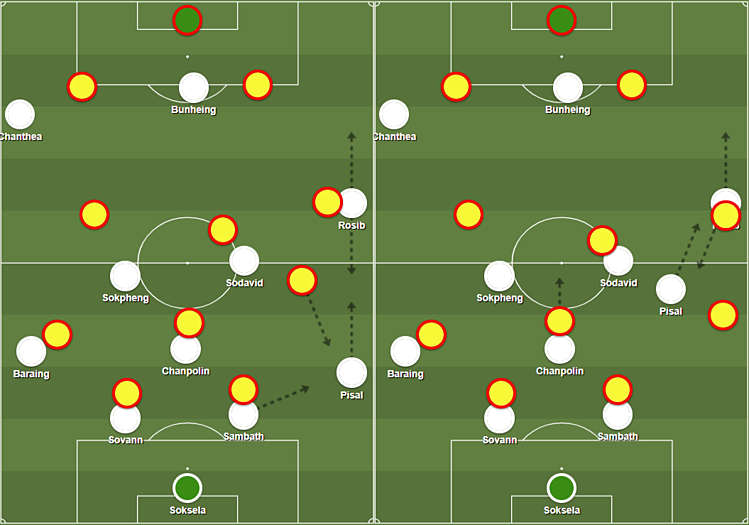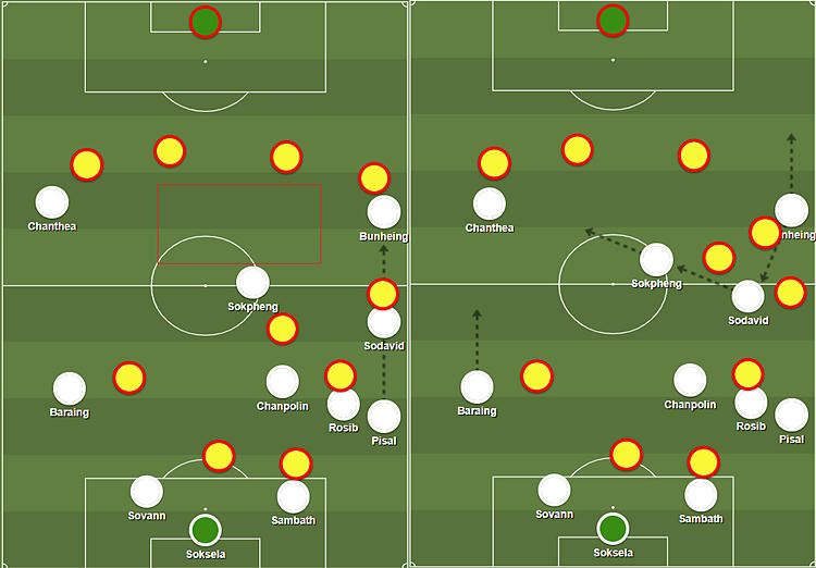 Cánh phải của Campuchia thường hiện diện trung vệ lệch phải Sovann, hậu vệ phải Pisal Kan, tiền vệ trung tâm Sodavid và tiền đạo phải Rosib. Họ không thường tạo ra ưu thế quân số (overload) ở cánh phải, mà chủ yếu phối nhỏ và chạy chỗ không bóng. Họ luôn xử lý trước đối thủ một nhịp để dễ tạo bất ngờ và rối loạn.