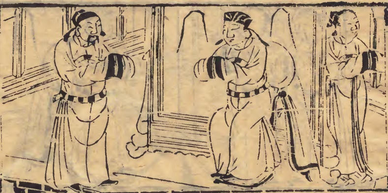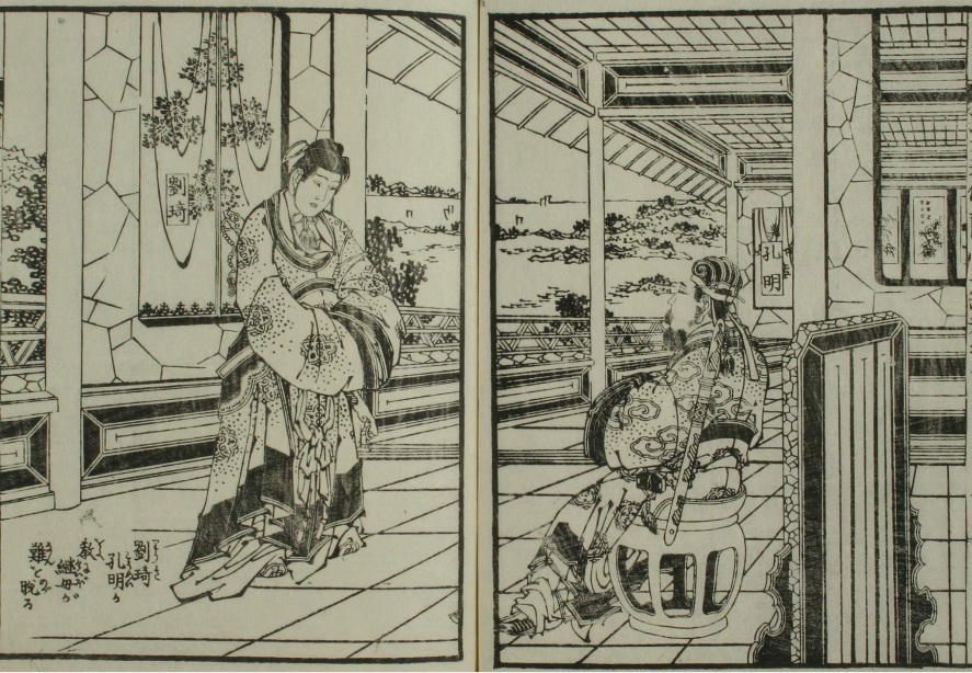 | Vương Xán (trái) thuyết phục Lưu Tông hàng Tào.Sái phu nhân nghe lỏm. Theo Vương Xán, Lưu Biểu đã đề cử Lưu Bị làm Thứ sử Kinh Châu |