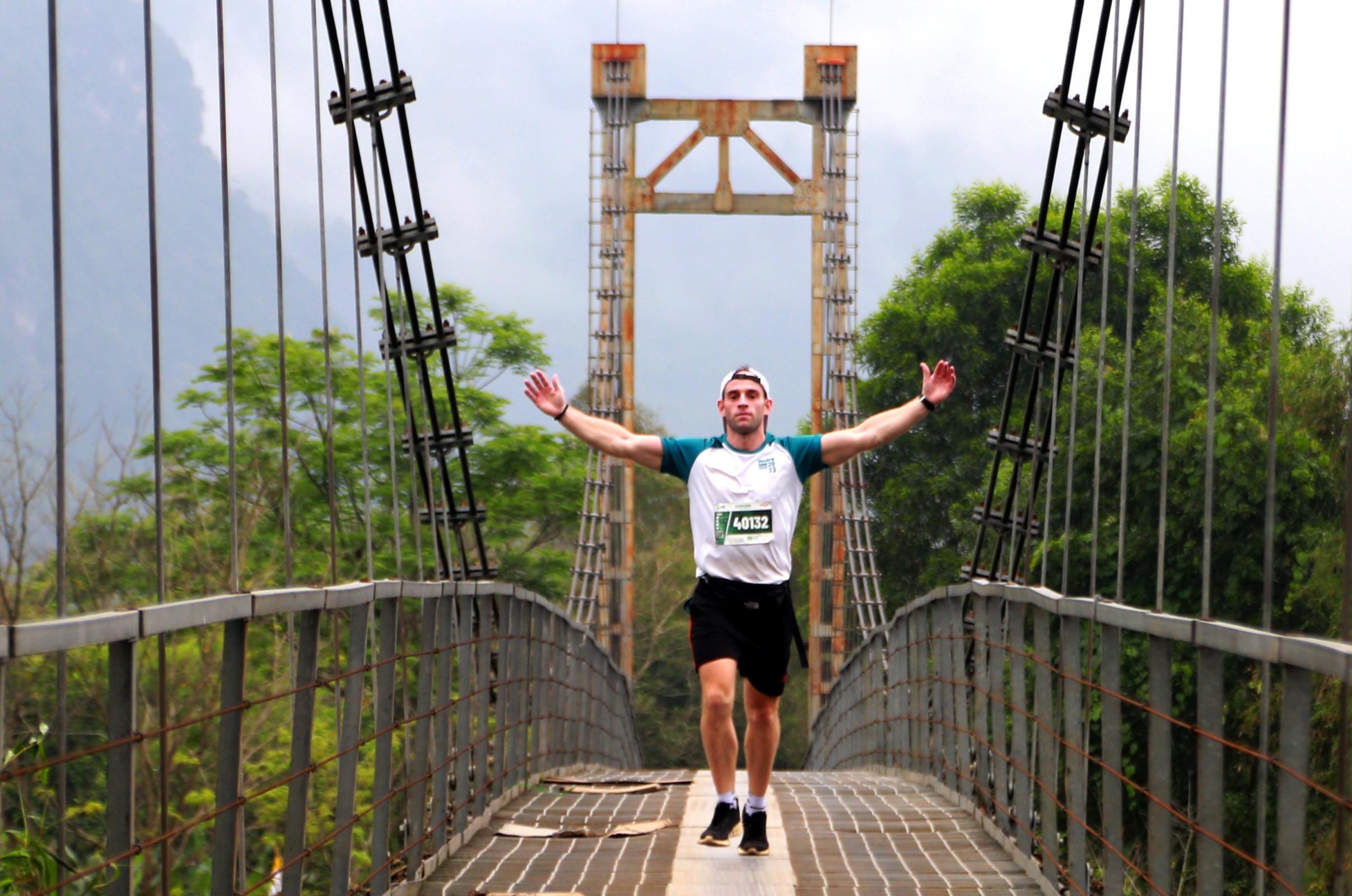Một nam VĐV vượt qua cầu Trạ Ang trên đường Hồ Chí Minh khi mặt trời vừa ló dạng sau đỉnh núi đá vôi.