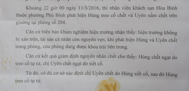 Tiếp đó, ngày 21/3, Viện kiểm sát nhân dân TX. Long Khánh ra quyết định không khởi tố hình sự vụ án. Căn cứ vào bản khám nghiệm tử thi, biên bản khám nghiệm hiện trường, đủ cơ sở xác định chị Uyên chết do anh Hùng siết cổ, sau đó anh Hùng treo cổ tự tử.