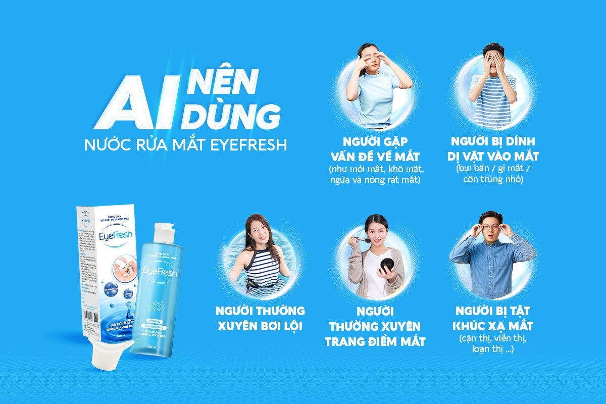 Nước rửa mắt EyeFresh đặc biệt hiệu quả cho những người thường xuyên làm việc trước màn hình máy tính hoặc những người thường xuyên tiếp xúc với môi trường bụi bẩn. Sản phẩm không chỉ làm sạch mắt mà còn giúp giảm các vấn đề về mắt như khô mắt, đỏ mắt, và mỏi mắt.