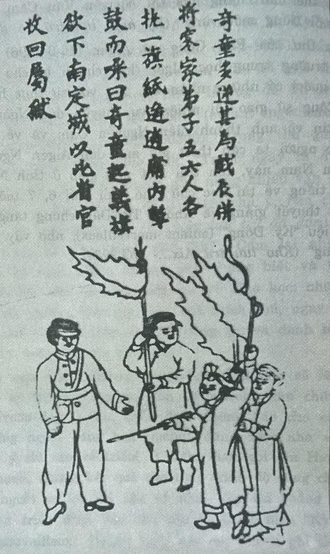 Tên lính gác ngạc nhiên lên tiếng chặn hỏi. Đám rước vẫn tiến lên, không có tiếng đáp lại. Lính gác nổ súng. Đám người tản ra như chim sẻ… Vài người nấp trong một đống củi, bị phát hiện, khai rằng: chúng không có ý định theo Kỳ Đồng làm điều phạm pháp; chúng tưởng Kỳ Đồng đi thăm bệnh vì Kỳ Đồng rất giỏi nghề thuốc. Hơn thế, cậu bé còn biết rõ tương lai, hậu vận”.