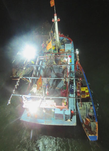 Đến hơn 20h cùng ngày, sà lan V73 – 00206 tiếp cận được khu vực tàu cá bị mắc cạn. Sà lan này đã khẩn trương chĩa ống hút về phía dưới đáy vùng tàu cá bị mắc cạn, để cho bánh lái tàu cá có thể hoạt động trở lại và đẩy bật tàu ra khỏi vùng đáy cạn do bị bồi lấp.