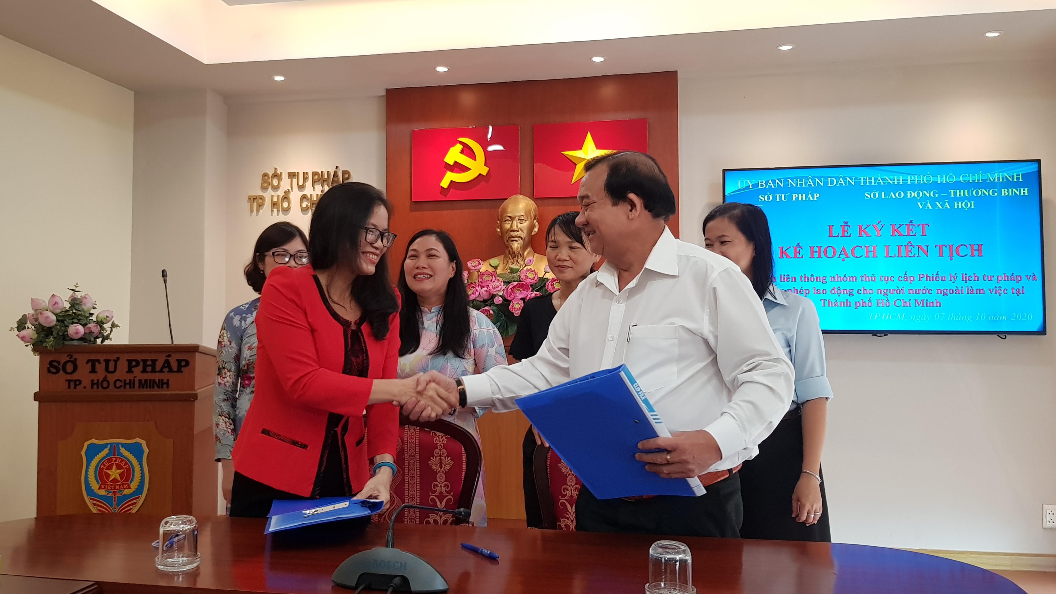 Ngày 7/10/2020, tại Sở Tư pháp TPHCM đã diễn ra Lễ kí kết Kế hoạch liên tịch triển khai thực hiện Quy chế liên thông nhóm thủ tục cấp Phiếu lý lịch Tư pháp và cấp giấy phép lao động cho người nước ngoài làm việc tại TP.HCM giữa Sở Lao động Thương binh & Xã hội và Sở Tư pháp TP.HCM. Buổi kí kết có sự hiện diện của ban lãnh đạo hai Sở cùng hơn 10 doanh nghiệp có sử dụng người lao động nước ngoài trên địa bàn TP.