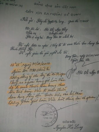 Thậm chí, mẹ chồng là vợ liệt sỹ mà vợ chồng bà Thủy đang trực tiếp nuôi dưỡng bị mắc căn bệnh hiểm nghèo phải nằm cấp cứu tại bệnh viện, bà Thủy viết đơn xin nghỉ 7 ngày (trừ vào phép) để vào viện chăm sóc mẹ chồng, ông Long cũng bút phê, đóng dấu: “... Đồng ý cho nghỉ phép 2 ngày 4 - 5/4/2013, đề nghị đồng chí bố trí công việc gia đình tiếp tục đi làm...”.
