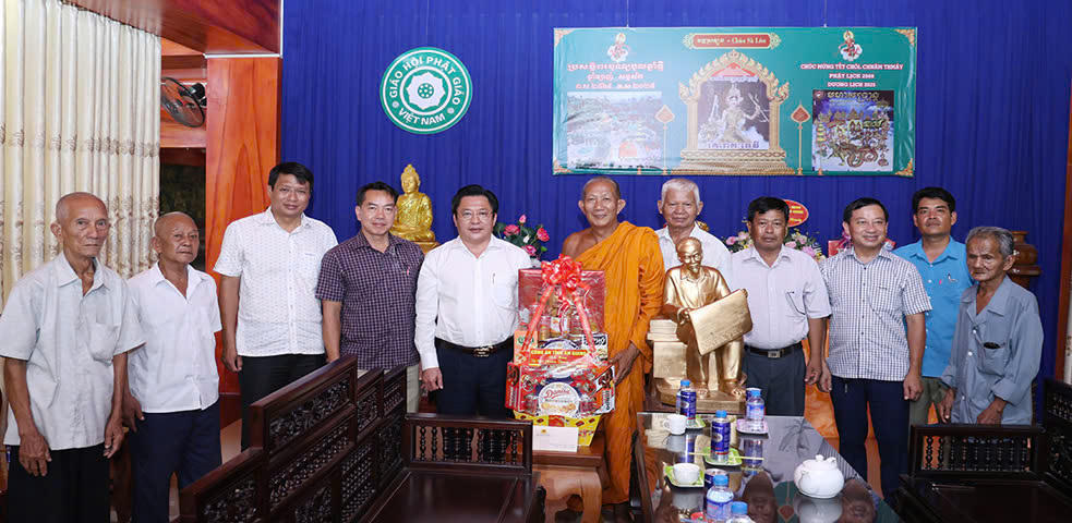 (PLVN) - Nhân dịp Tết cổ truyền Chôl Chnăm Thmây năm 2025 của đồng bào dân tộc Khmer, Đại tá Lâm Phước Nguyên - Giám đốc Công an tỉnh An Giang vừa dẫn đầu đoàn công tác đến thăm, tặng quà và chúc Tết Hoà thượng Chau Ty - Trụ trì chùa Soài So (xã Núi Tô, huyện Tri Tôn, tỉnh An Giang) và Hoà thượng Chau Sơn Hy - Trụ trì chùa Sà Lôn (xã Lương Phi, huyện Tri Tôn, tỉnh An Giang). Tham gia cùng đoàn còn có đại diện lãnh đạo Phòng An ninh nội địa, Phòng Tham mưu Công an tỉnh An Giang.
