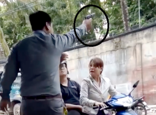 | Người được xác định là Giám đốc công ty an ninh Việt Nhật rút súng và bắn dọa mẹ con người phụ nữ. Ảnh cắt từ clip |