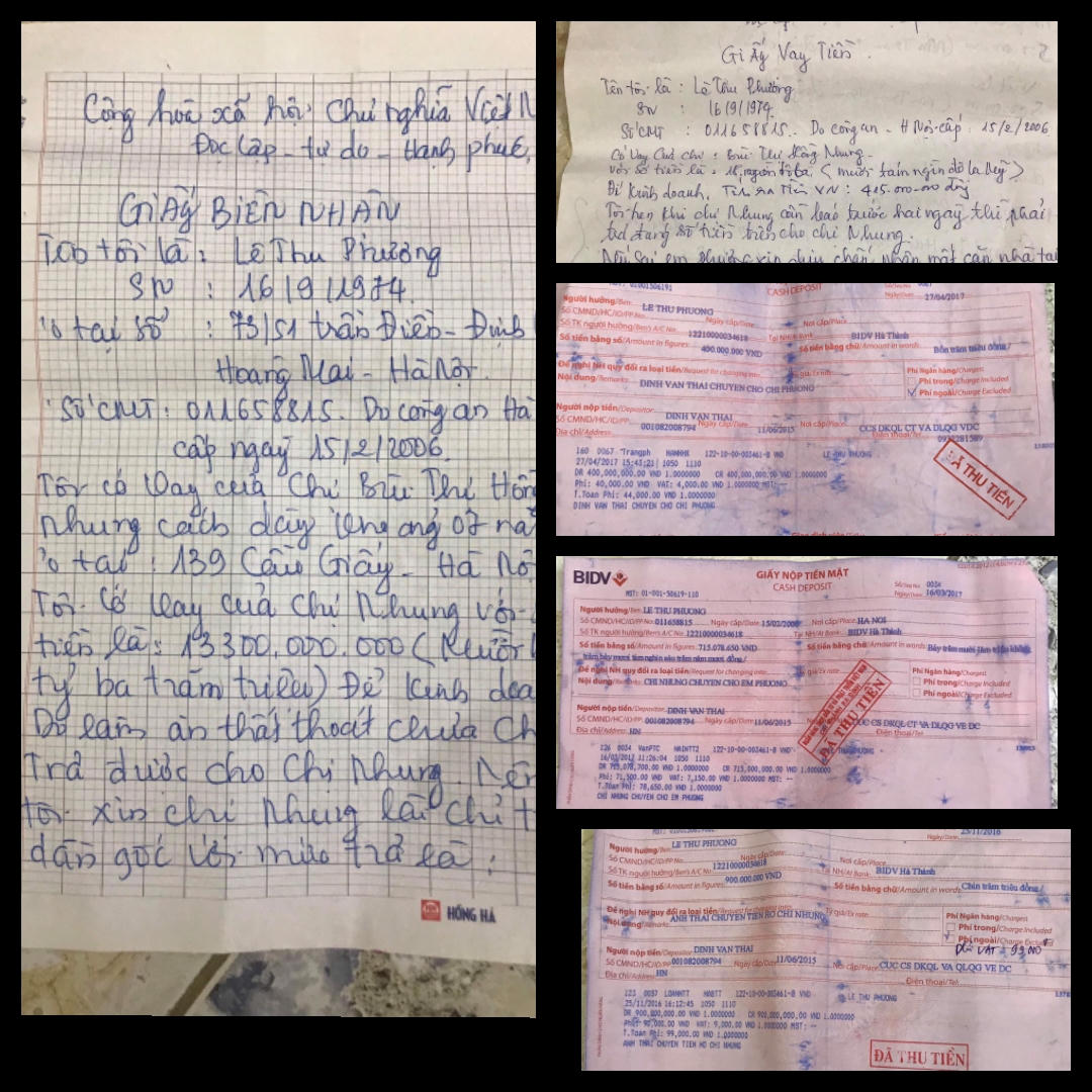 “Tháng 05/2018 tôi làm đơn tố cáo bà Phương lạm dụng tín nhiệm, chiếm đoạt hàng chục tỷ đồng. Đích thân Trung tá Lê Kim Đồng - (Đội trưởng Đội 5, Phòng CSHS - Công an TP Hà Nội) đã tiếp nhận, chỉ đạo điều tra làm rõ. Qua điều tra, các cán bộ điều tra Đội 5 đã làm rõ được việc bà Phương vay của tôi hàng chục tỷ đồng qua các giao dịch Ngân hàng BIDV và giấy biên nhận tiền.