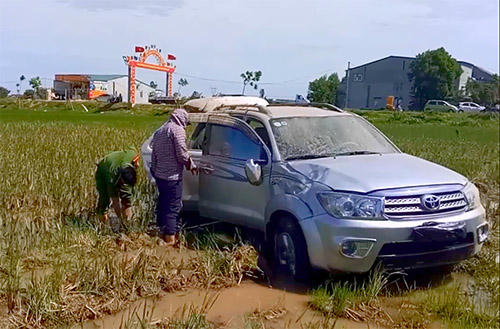Chiếc Fortuner do Giám đốc Tiến điều khiển lao xuống ruộng sau va chạm với xe tuần tra của cảnh sát. Ảnh: Đức Hùng |