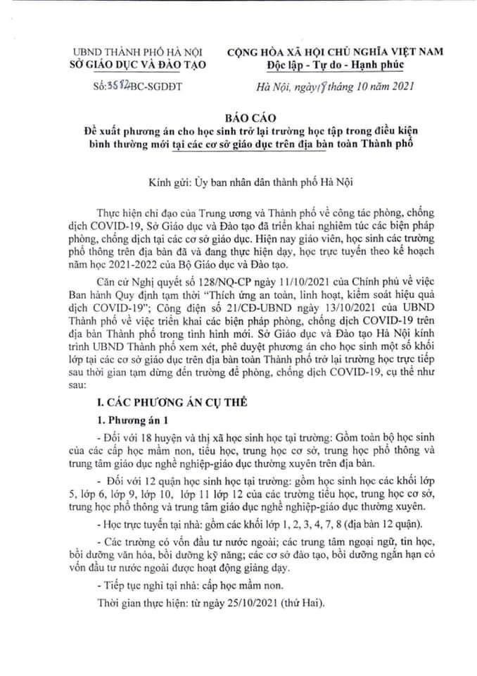 Theo Vietnemnet, ngày 18/10, Sở GD-ĐT Hà Nội có văn bản đề xuất 4 phương án cho học sinh trở lại trường học trực tiếp. Tuy nhiên, ngay sau đó, Giám đốc Sở GD-ĐT Hà Nội phủ nhận thông tin nói trên.