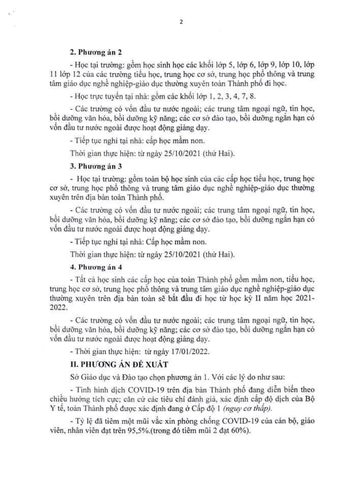 Phương án 2, học sinh các khối lớp 5, 6, 9, 10, 11, 12 của các trường tiểu học, THCS, THPT và trung tâm giáo dục nghề nghiệp – giáo dục thường xuyên toàn thành phố đi học.