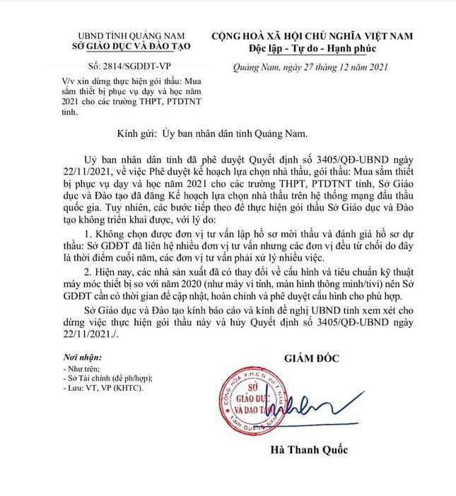 Tuy nhiên, đến ngày 27/12/2021, ông Hà Thanh Quốc (lúc này đang giữ chức Giám đốc sở GD&ĐT tỉnh Quảng Nam) có công văn về việc xin dừng thực hiện gói thầu nói trên.
