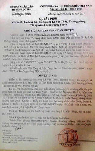 Theo đó, ngày 16/11, chủ tịch UBND huyện Lộc Hà đã ký quyết định kỷ luật cách chức đối với ông Lê Văn Thủy - Trưởng phòng TN&MT huyện này. Ông Thủy được xác định đã vi phạm quy định về thủ tục đất đai.