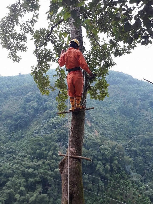 Chỉ trong tích tắc, các anh em đã chinh phục được độ cao hơn 15 mét so với mặt đất. Thay vì dùng máy cưa thì họ dùng rựa để chặt, rồi quấn dây thừng vào từng nhánh để mọi người bên dưới kéo theo hướng mình muốn, tránh ngã đổ vào đường dây sát bên. “Từng nhánh một được chặt hạ xen, lẫn trong công việc có phần nguy hiểm ấy là những tiếng cười hào sảng của anh em trong đoàn. Phải nói rằng, trong cái khó bao giờ cũng ló cái khôn; đoàn kết sẽ giúp ta vượt qua mọi trở ngại để dòng điện mãi sáng nơi đại ngàn” - anh Lê Hoạt chia sẻ.