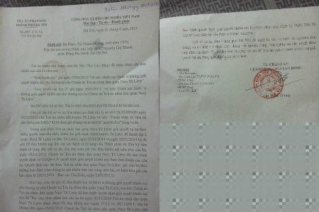 Công văn số 205/CV-TA ngày 1/4/2015 của TAND TP Hà Nội trả lời đối với các đơn khiếu nại ngày 7/1/2015 (lần 1) và ngày 26/1/2015 (lần 2) của chị Hương “về việc khiếu nại hành vi không giải quyết khiếu nại cho đương sự của Chánh án TAND quận Nam Từ Liêm”.