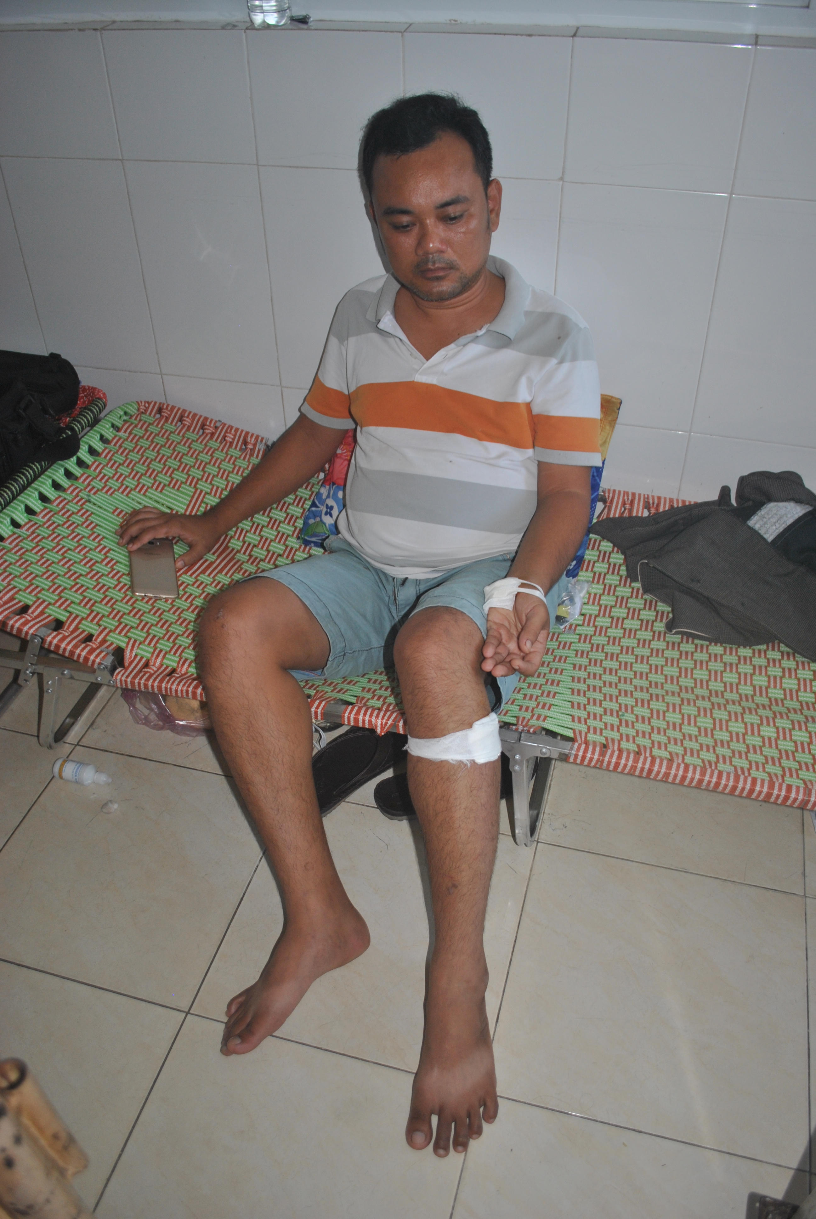 “Đây là xe dịch vụ của gia đình nên sau khi đưa bệnh nhân lên xe, tôi cũng lên ghế phía bên phụ đi cùng. Tuy nhiên, khi xe vừa từ khuôn viên TTYT huyện ra khỏi cổng thì bị Tài chặn đầu, mở cửa xe và dùng dao xông vào đâm chém loạn xạ. Lúc đó tôi mất nhiều máu, ngất tại chỗ. May mà có người quen can ngăn, tài xế vội cho xe chạy vào Công an huyện Phù Mỹ cạnh đó”, anh Vương kể lại.