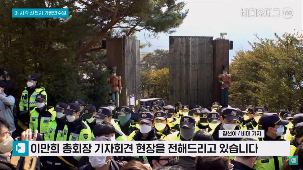 Cảnh sát được huy động với số lượng lớn bên ngoài địa điểm tổ chức họp báo của ông Lee Man Hee.Ảnh chụp màn hình. |
