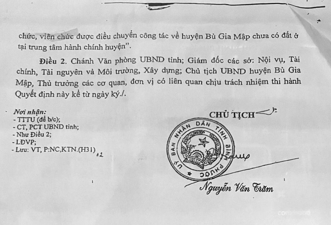 Tại Quyết định 2665/QĐ-UBND ngày 31/12/2013 và 1037/QĐ-UBND ngày 5/5/2016 của UBND tỉnh (phê duyệt phương án giao đất đợt 2) cũng đều ghi rõ, đối tượng được giao đất không qua đấu giá là “Thứ nhất, CBCCVC; Thứ hai, được điều chuyển công tác về huyện Bù Gia Mập; Thứ ba, chưa có đất ở”.