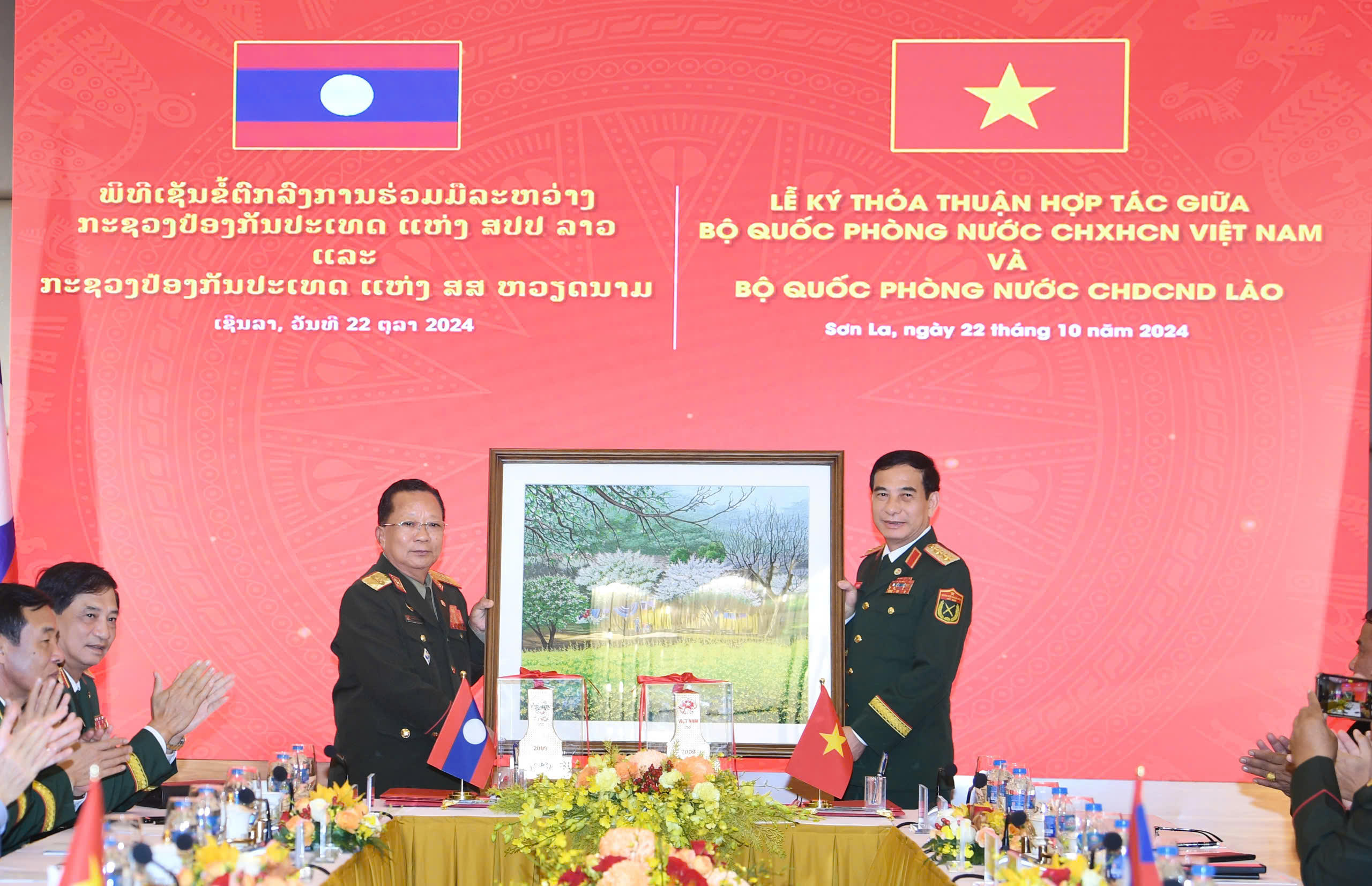 (PLVN) - Chiều 22/10/2024, tại Khách sạn Mường Thanh (huyện Mộc Châu, tỉnh Sơn La), Đại tướng Phan Văn Giang, Ủy viên Bộ Chính trị, Phó Bí thư Quân ủy Trung ương, Bộ trưởng Bộ Quốc phòng Việt Nam và Đại tướng Chansamone Chanyalath (Chăn-sạ-mỏn Chăn-nha-lạt), Ủy viên Bộ Chính trị, Phó Thủ tướng Chính phủ, Bộ trưởng Bộ Quốc phòng Lào đã đồng chủ trì Hội đàm, ký kết văn kiện hợp tác giữa Bộ Quốc phòng nước CHXHCN Việt Nam và Bộ Quốc phòng nước CHDCND Lào.