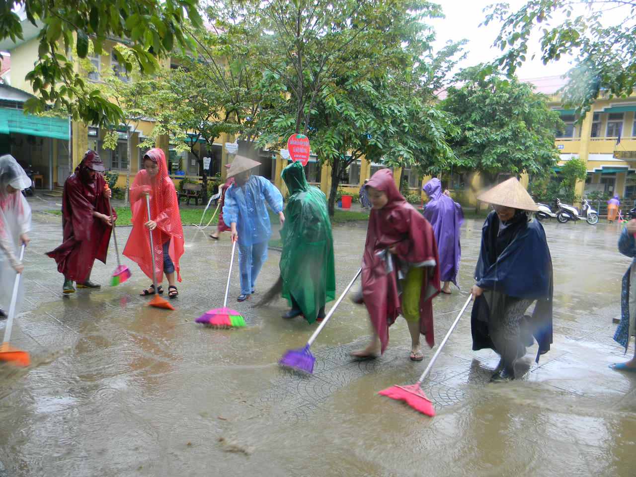 Ngay sau khi lũ vừa rút, Ban Giám hiệu nhà trường đã nhanh chóng tổ chức cho thầy cô và phụ huynh học sinh quét dọn bùn đất và rác, đảm bảo vệ sinh sạch sẽ cho toàn bộ trường học.