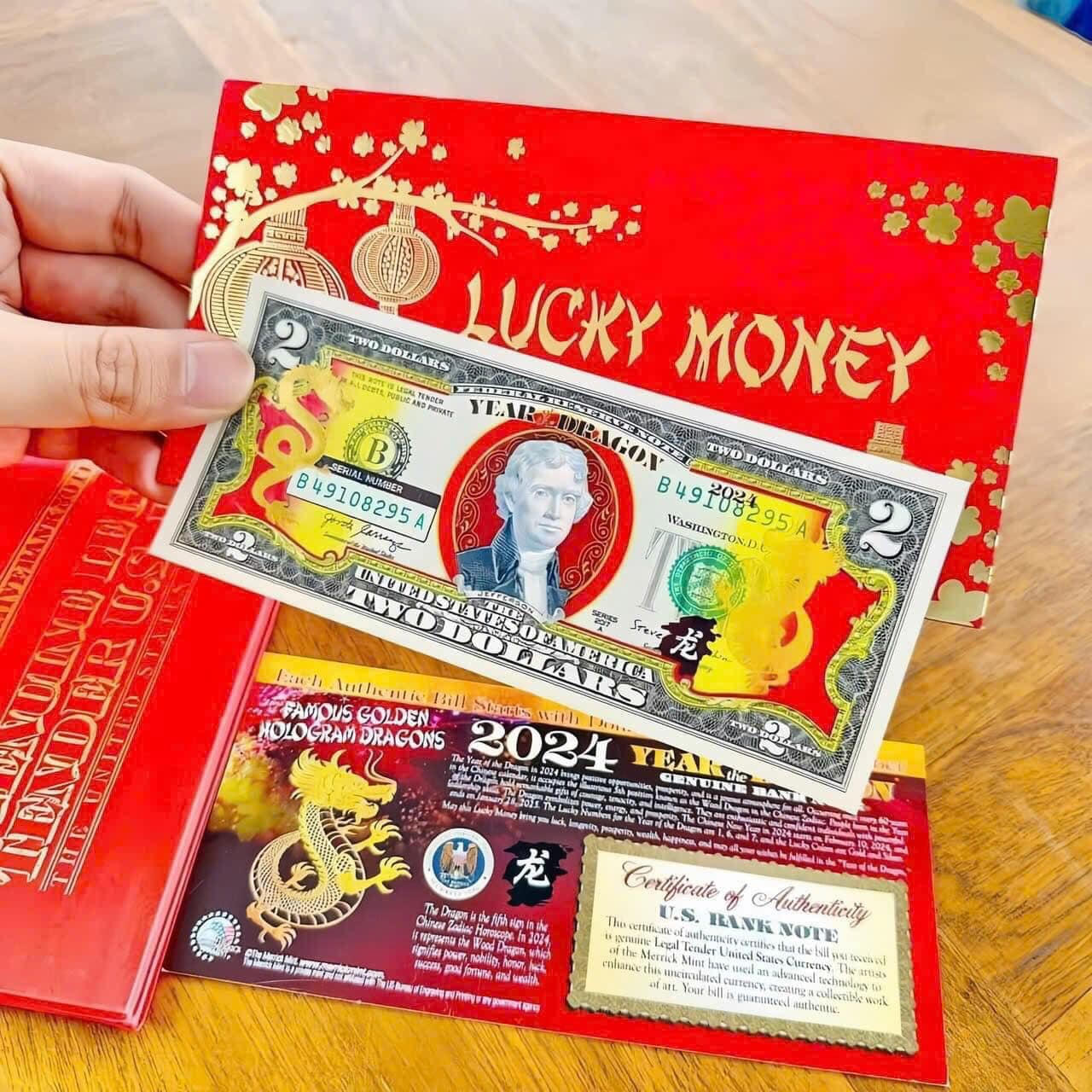 Khảo sát trên thị trường cho thấy, phổ biến nhất vẫn là tờ 2 USD hình con Rồng 2024. Theo quan niệm người phương Đông, số 2 là số may mắn, hạnh phúc do vậy tờ 2 USD cũng có ý nghĩa tương tự. Chính vì thế đầu năm mới, tờ 2 USD mạ vàng in con Rồng được nhiều người săn lùng. Tờ tiền này có giá dao động từ 100.000-150.000 đồng/tờ. Mặt trước của tờ 2USD giống tờ 2USD thông dụng, mặt sau là hình ảnh Tổng thống Thomas Jefferson ở giữa, bên phải và bên trái là hình ảnh 2 con Rồng vàng.