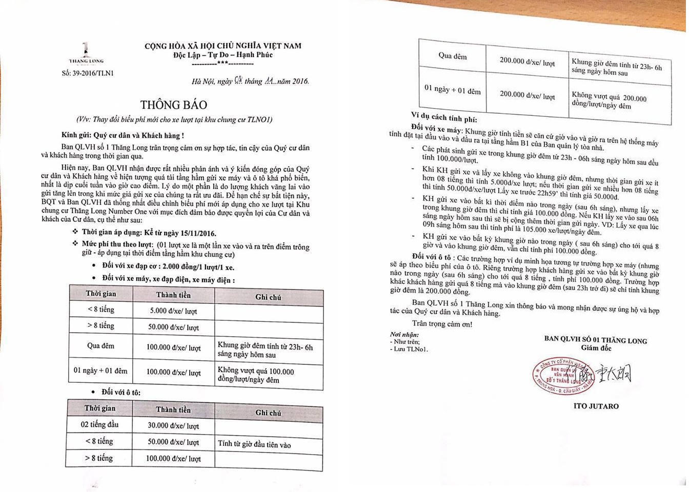 (PLO) - Nếu muốn gửi xe tại chung cư Thăng Long Number One thì người dân phải trả 100 nghìn đồng/xe máy/ đêm và 200 nghìn đồng/ô tô/ đêm. Với phí gửi xe như thế này, ban quản lý chung cư Thăng Long Number One đang thu phí gửi xe cao gấp nhiều lần quy định của pháp luật.