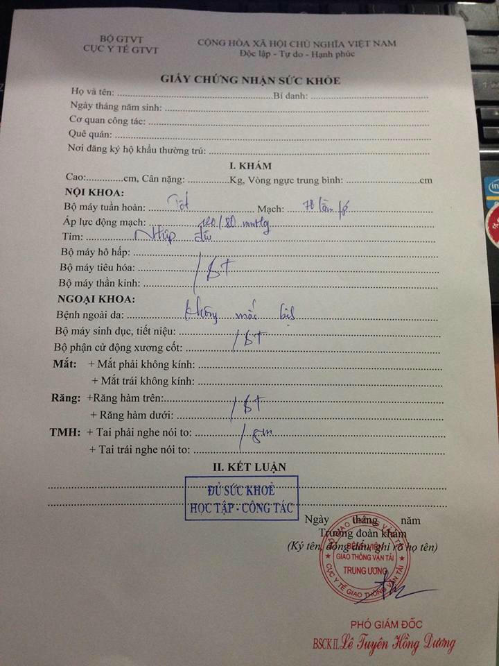 Thắc mắc về vấn đề này, Fb Ngọc Huyền lý giải, thông thường khách sẽ tự điền vào những chỗ còn trống trên giấy chứng nhận. Và với những người chưa biết, thì chính chị ta sẽ là người ghi các thông số sức khỏe trên giấy chứng nhận, từ khám nội khoa, ngoại khoa cho đến phần kết luận. Họ tên và các chỉ số về chiều cao, cân nặng sẽ do khách hàng cung cấp.