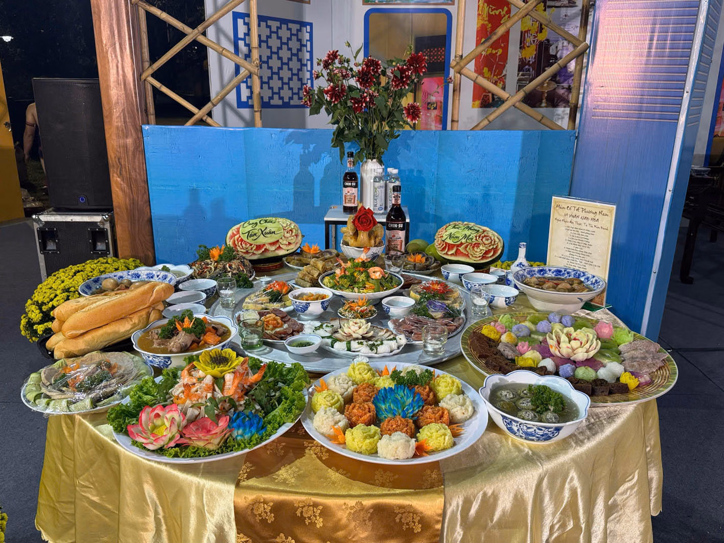 Trong khi đó, mâm cỗ Tết ở miền Nam lại mở ra sắc thái phóng khoáng, trù phú, rộn ràng. Sự giao thoa văn hóa giữa nhiều cộng đồng dân cư đã góp phần tạo nên một nền ẩm thực đa dạng, cởi mở. Bánh tét tiếp tục giữ vị trí trung tâm nhưng được biến tấu thành nhiều loại như bánh tét mặn, bánh tét chay, bánh tét ngọt. Món thịt kho tàu, thịt kho trứng nấu cùng nước dừa béo ngậy là biểu tượng của sự đủ đầy, sung túc; còn canh khổ qua nhồi thịt gửi gắm niềm tin rằng mọi vất vả, khó khăn của năm cũ sẽ qua đi khi năm mới đến.