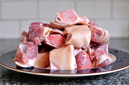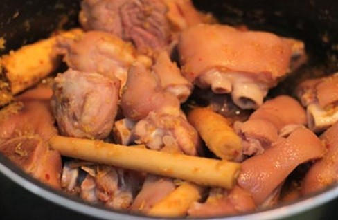 Bước 1 : Chân giò mua về bạn đem chặt khúc vừa ăn, sau đó đem rửa sạch cùng với muối loãng.