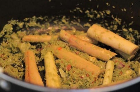 Bước 4 : Bạn đem bắc chảo lên bếp sau cho dầu ăn vào đun phi thơm lên rồi đem cho ớt bột, sả vào xào qua 2 phút dậy mùi lên thì cho sả cây vào xào chung nhé.