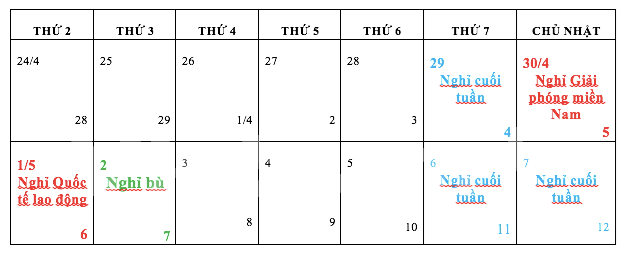 Dịp nghỉ lễ Giải phóng miền Nam 30/4 và Quốc tế Lao động 1/5 có bốn ngày nghỉ liên tiếp từ ngày 29/4 đến 2/5/2017.