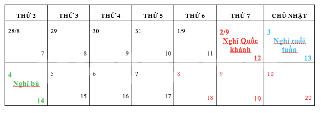 Ngày Quốc khánh 2/9 rơi vào thứ Bảy, công chức được nghỉ bù vào thứ Hai ngày 4/9, tổng cộng nghỉ liên tiếp 3 ngày.