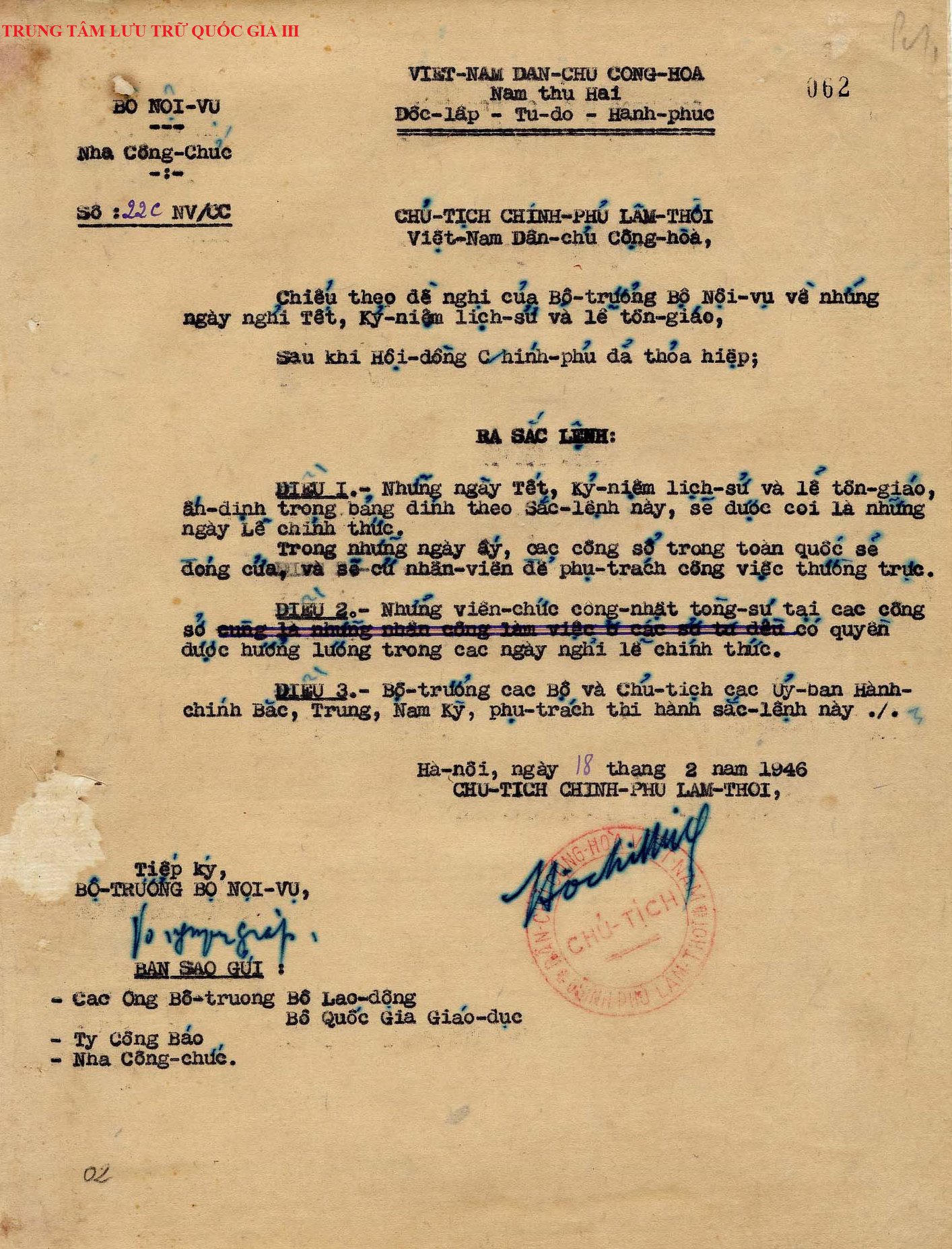 Sắc lệnh về những ngày Tết, kỷ niệm lịch sử do Chủ tịch Chính phủ lâm thời Hồ Chí Minh ký. Nguồn: Trung tâm lưu trữ Quốc gia III. |
