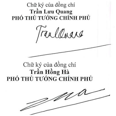 Giới thiệu chữ ký 2 Phó Thủ tướng Trần Lưu Quang và Trần Hồng Hà